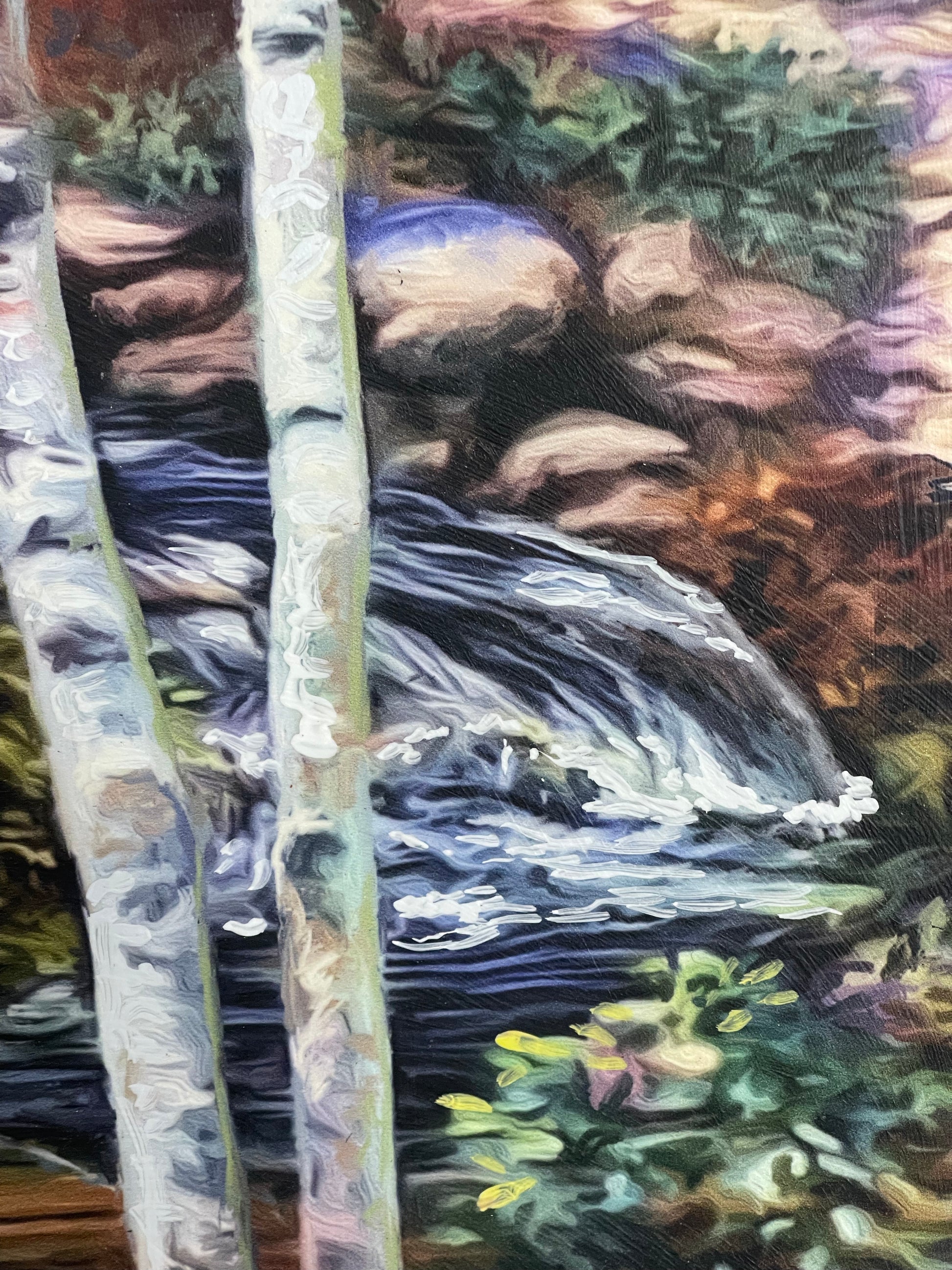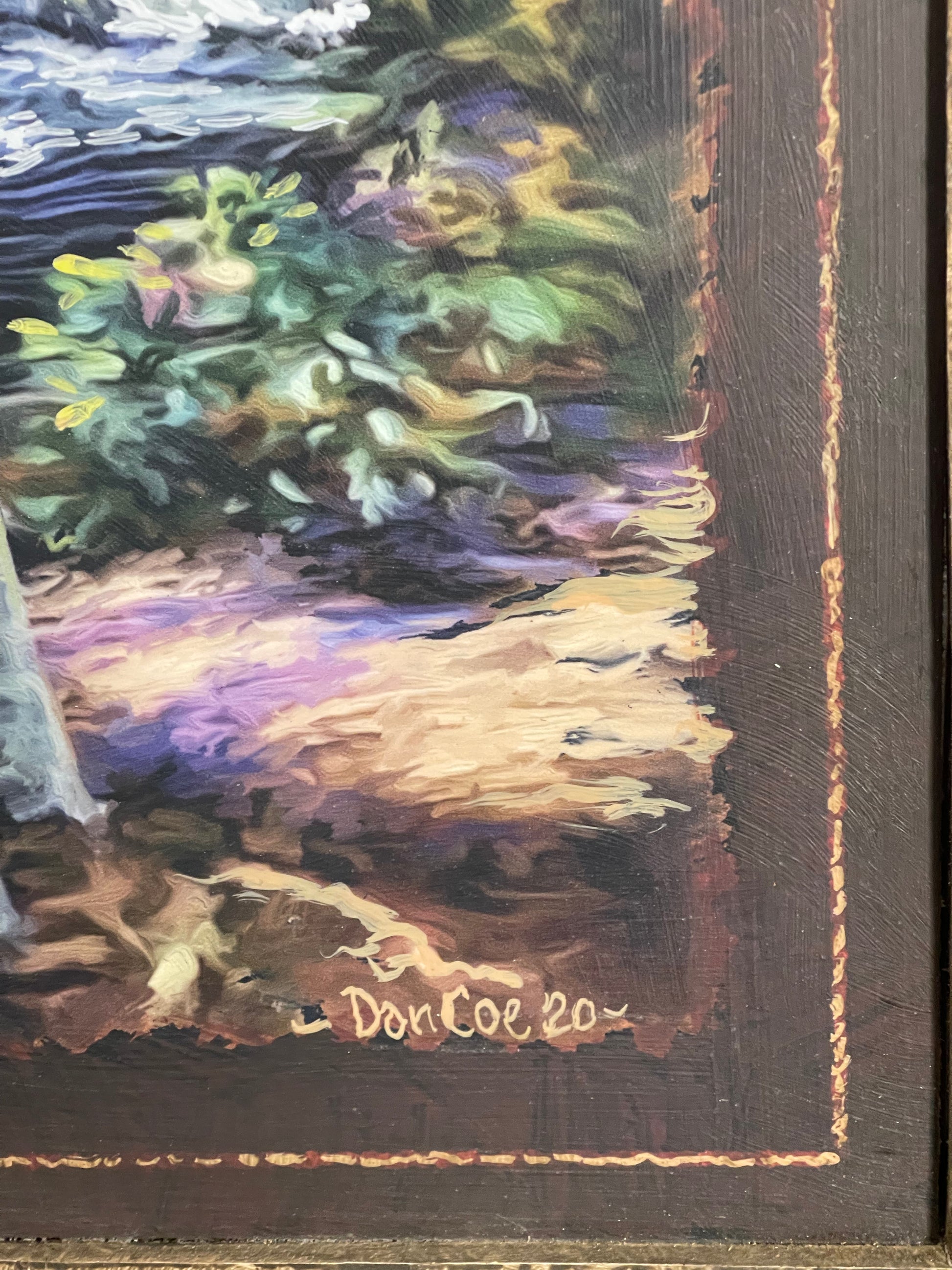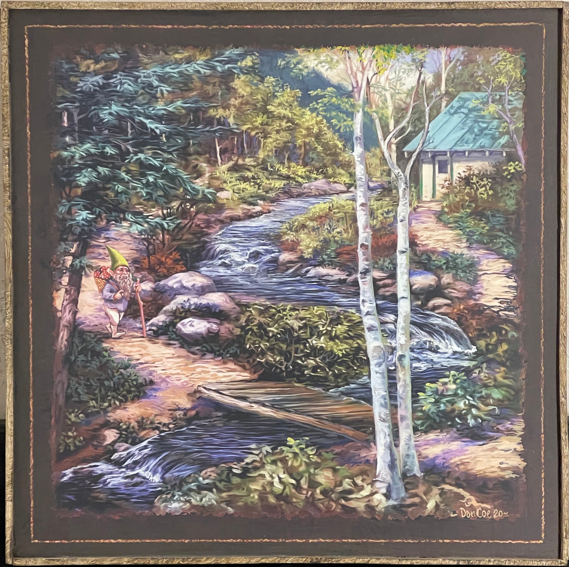With a bountiful haul of mushrooms in tow, the gnome embarks on his journey homeward, accompanied by the soothing sounds of a crystal-clear stream. Measuring 23" x 23", this image has been digitally generated, printed with latex inks rendering amazing color on foamboard mounted on wood lattice crate-style frame and stretcher bars. Then I over paint with acrylic paint the details such as white highlights in the water and frame coloration. Signed 2020.