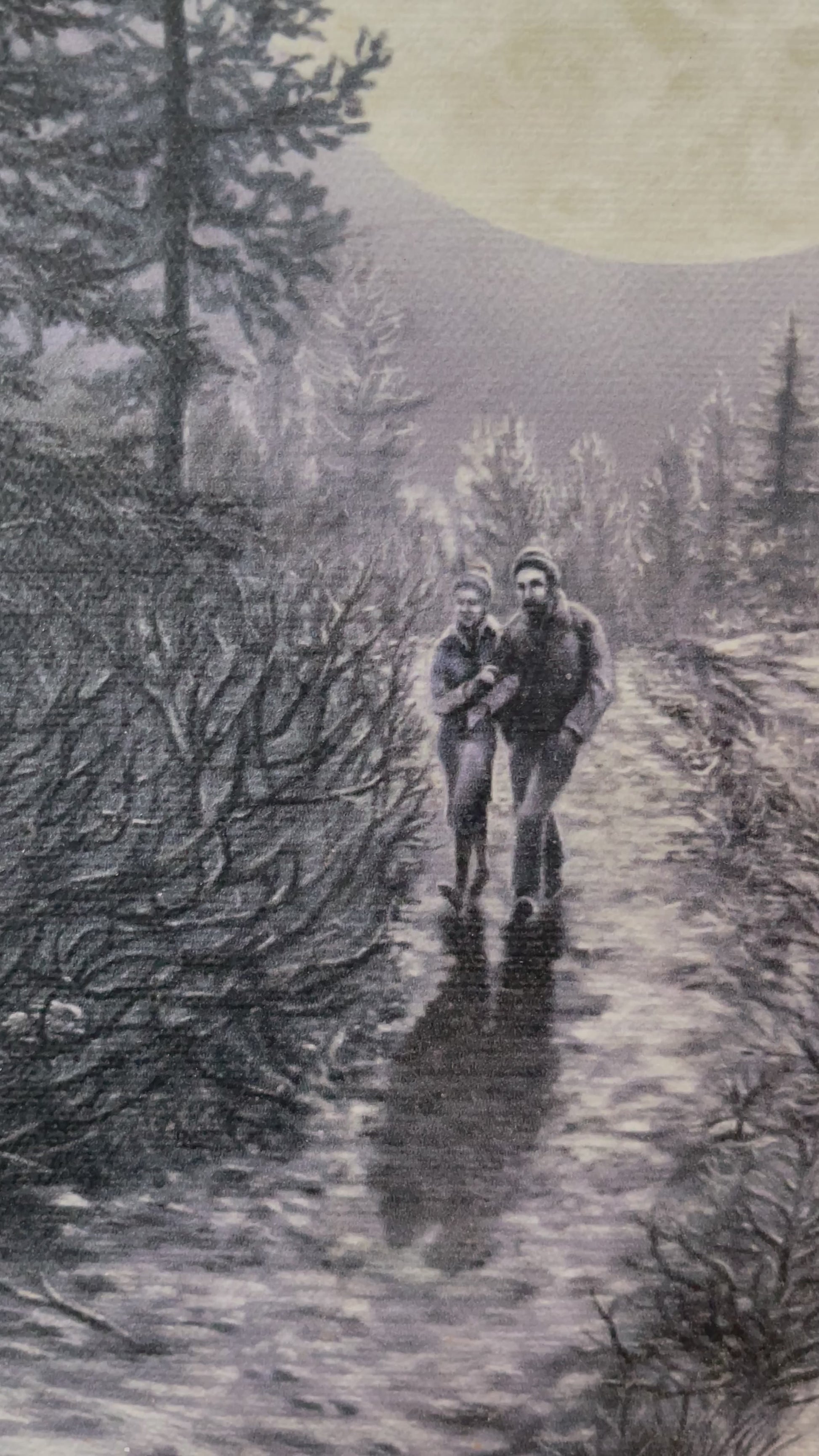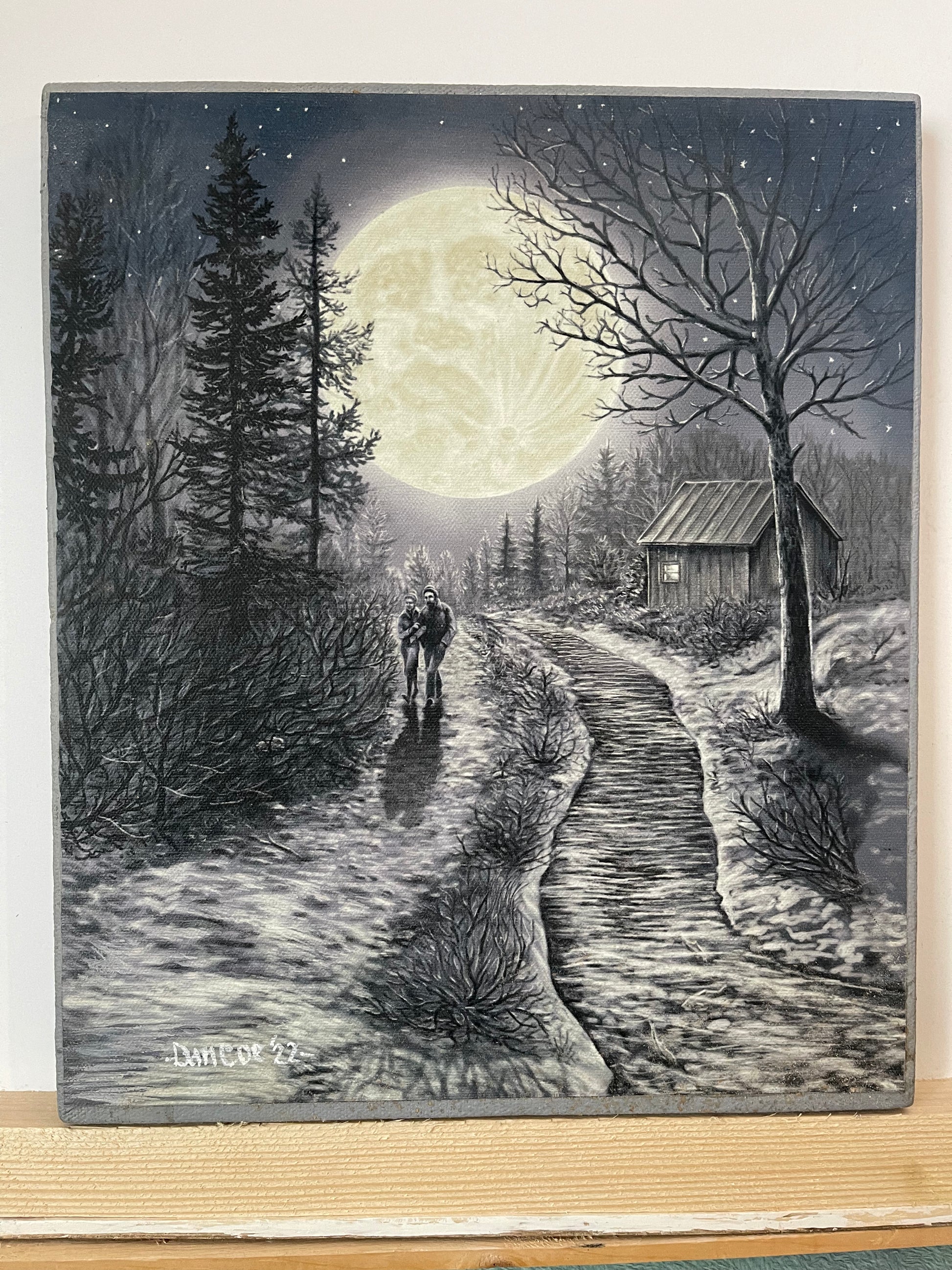 A couple takes a romantic stroll on a moonlit path, evoking vintage charm and a serene ambiance. Canvas print 11”x13” on 3/4” stretchers, enhanced with acrylic paint and signed with the year by the artist.