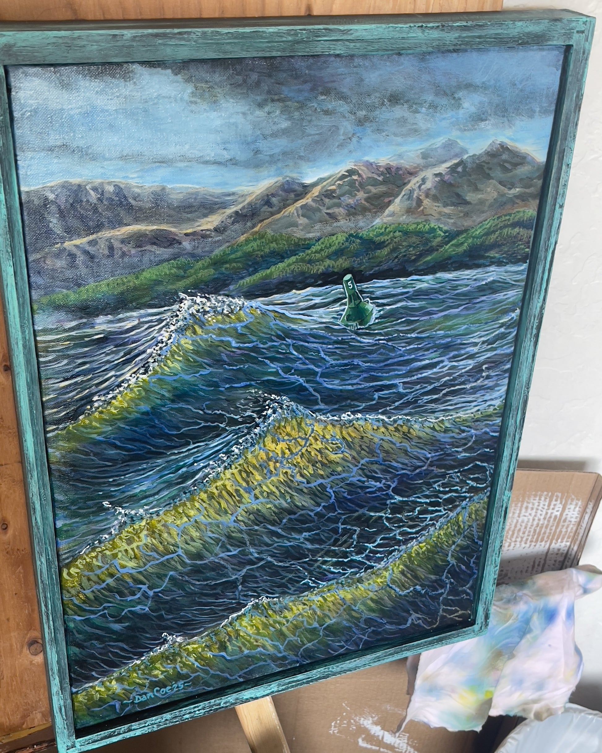 This painting is on canvas measuring 17"x21" with the painted strip frame