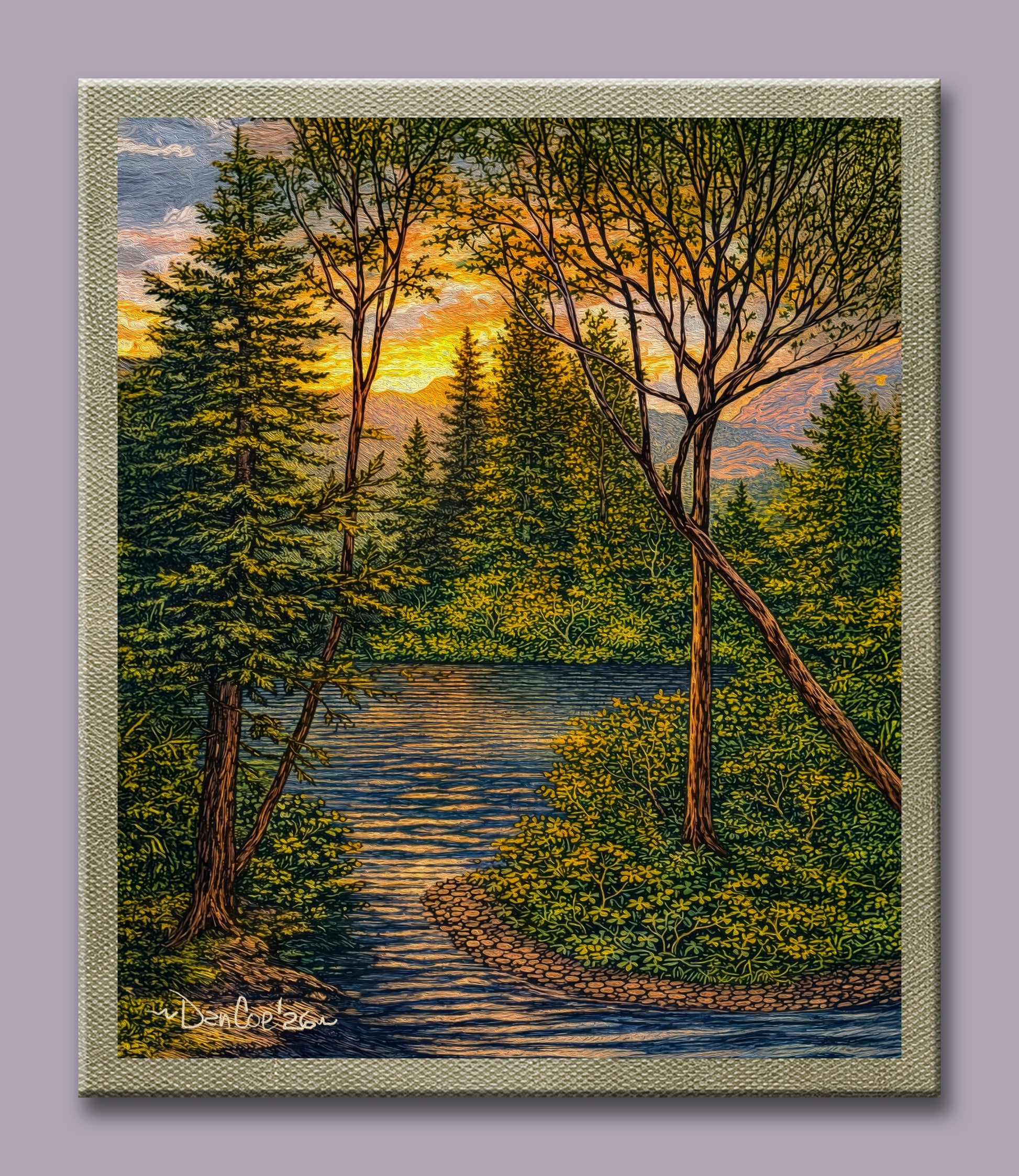I cut my own stretcher bars, then using water based polymers affix the canvas print to 10 oz cotton during cotton duck canvas. Each boarder is then painted with the overall picture clear coated and signed.