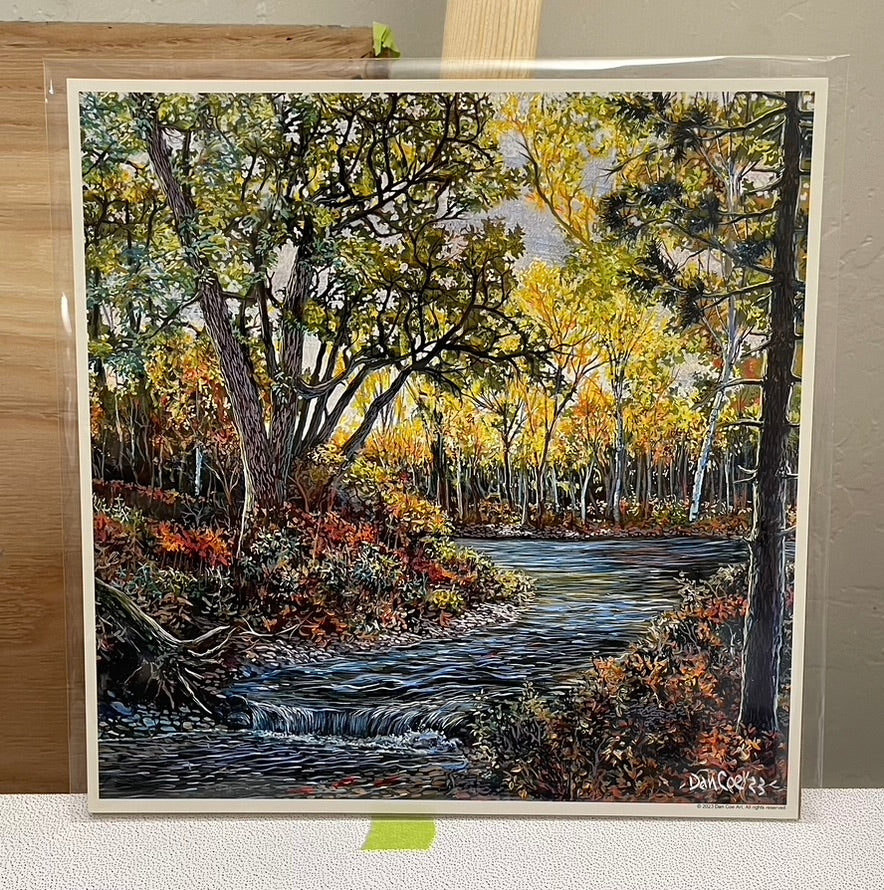 12”x12” ink jet on coated 16pt card stock. Each are individually signed and dated with the year. I'm pleased with the print quality and detail of each one. They ship flat in a crystal clear sleeve with backing board.