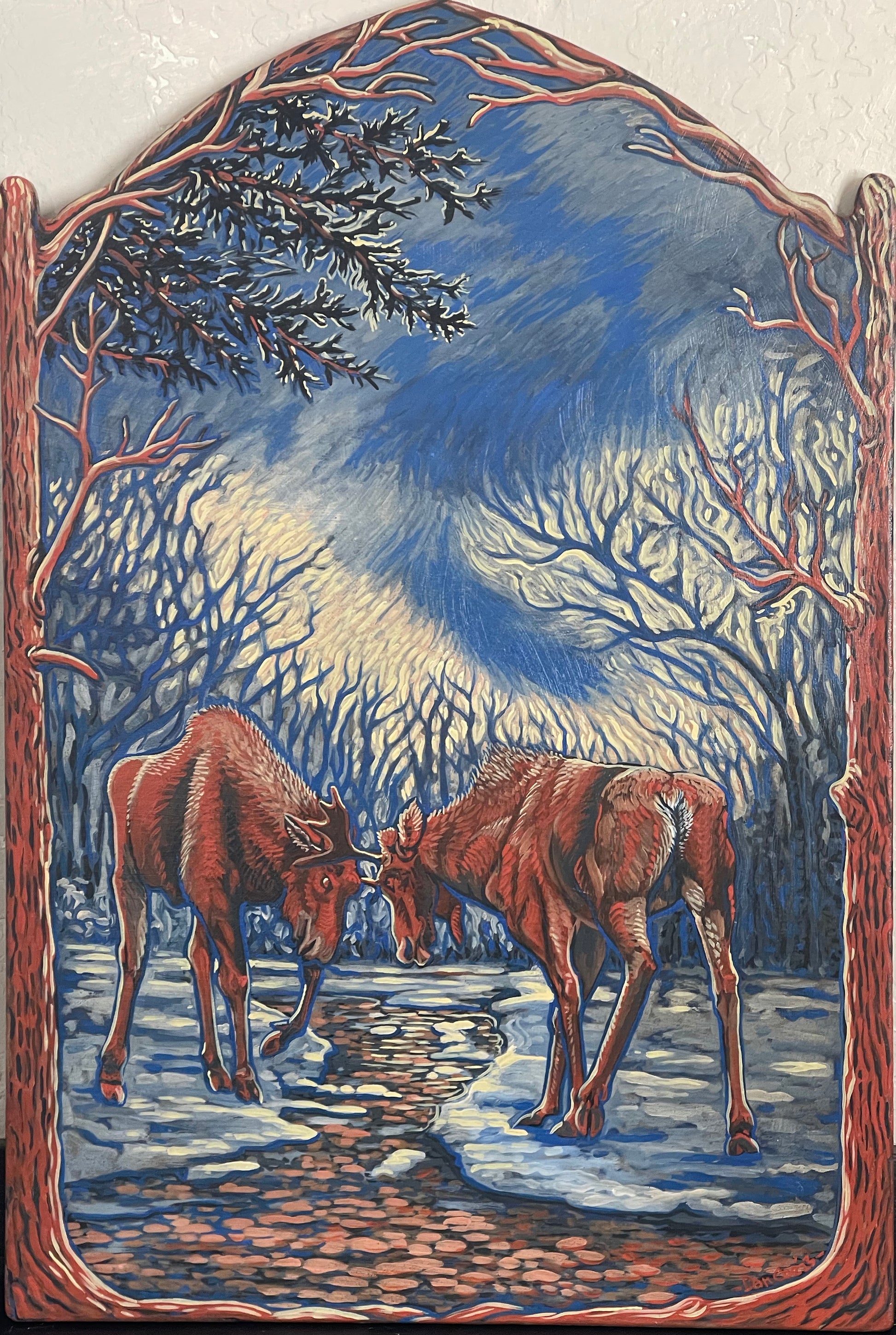 This painting is rendered in acrylics in the style of a mid-century outdoor sporting poster. Signed 2023.