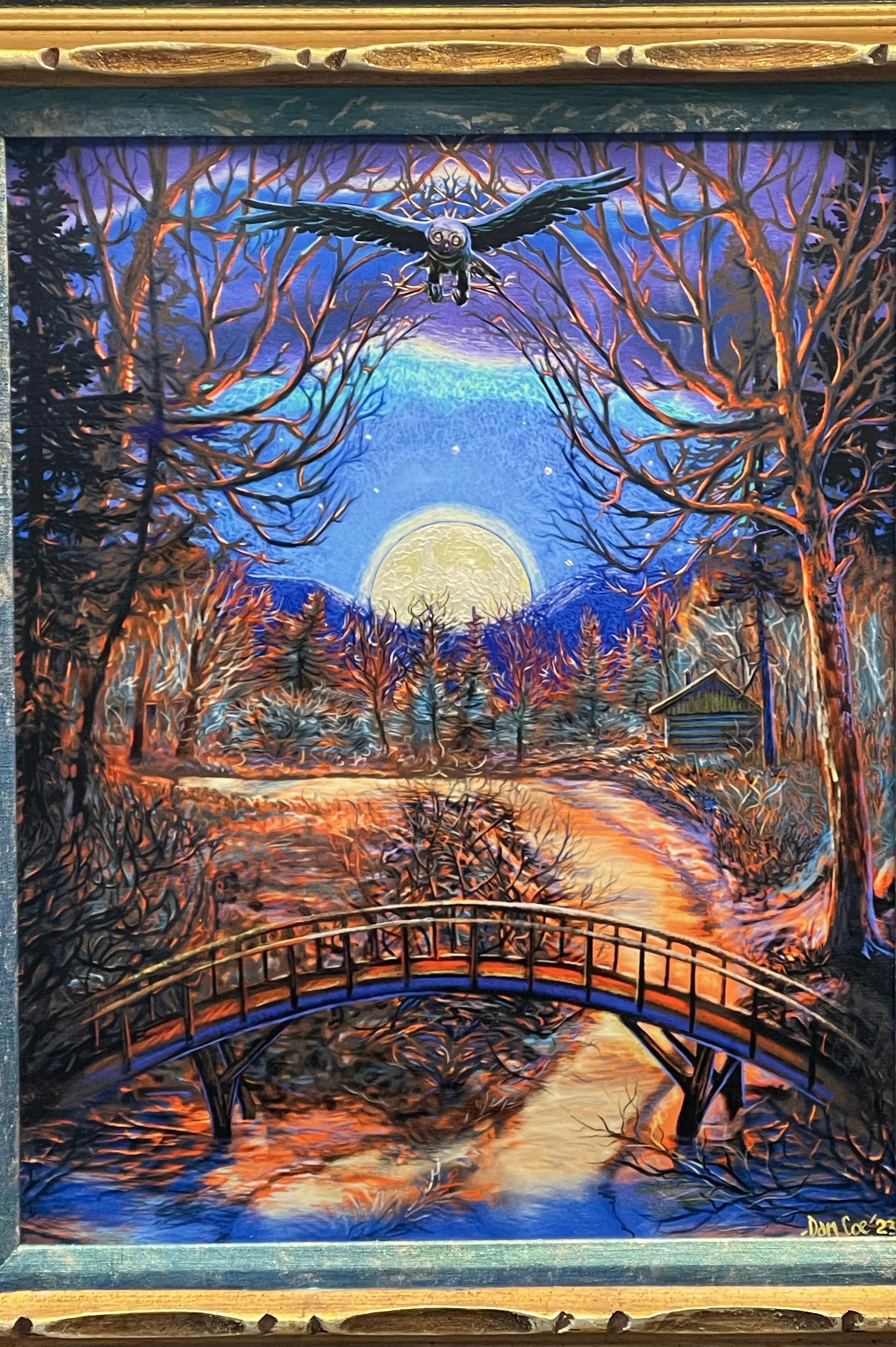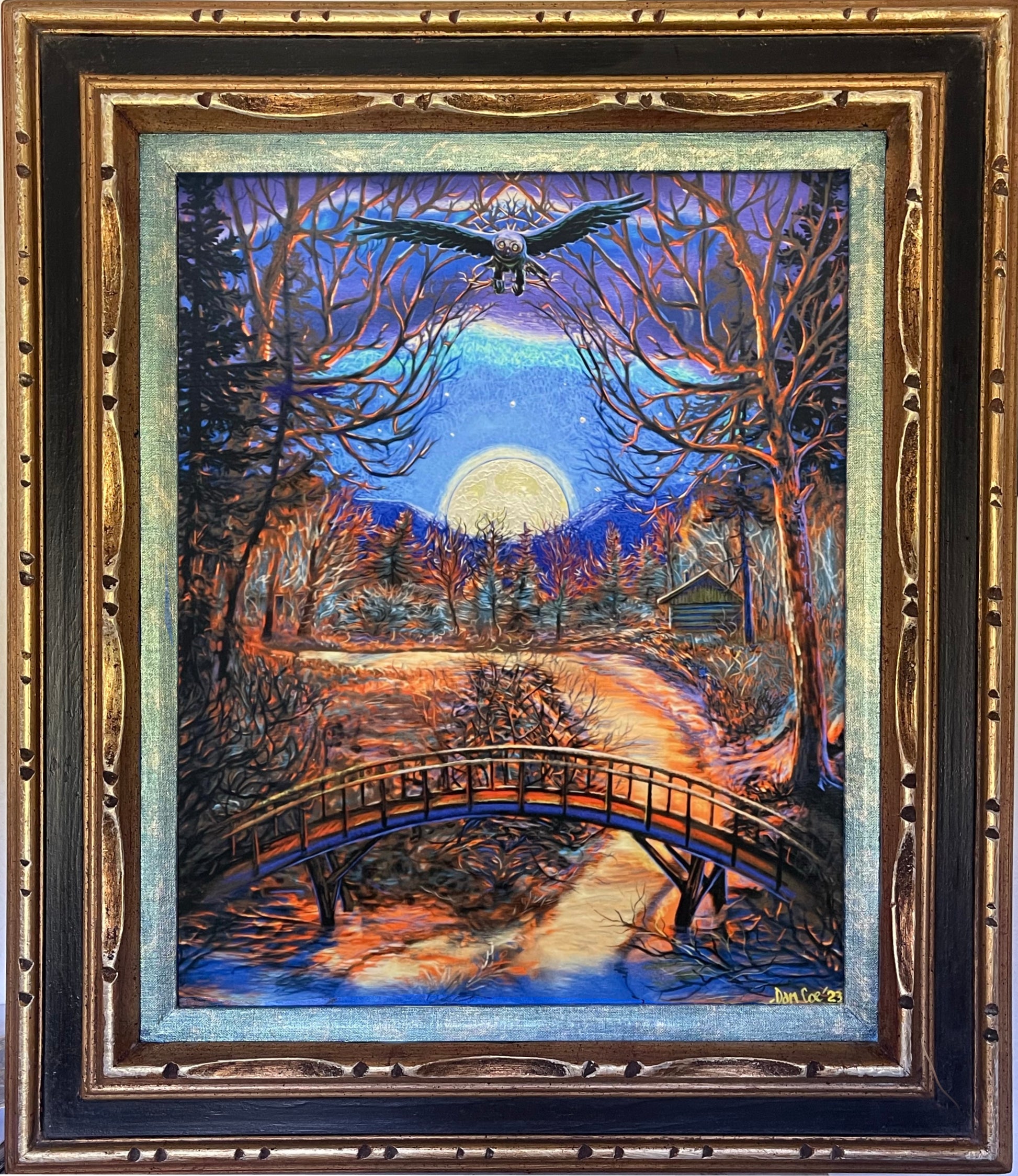 An owl soars beneath a moonlit archway, guarding the threshold between a dreamlike winter forest and a glowing, unseen world beyond. The footbridge, bathed in spectral light, leads the viewer along a winding path into a surreal convergence of night and memory.