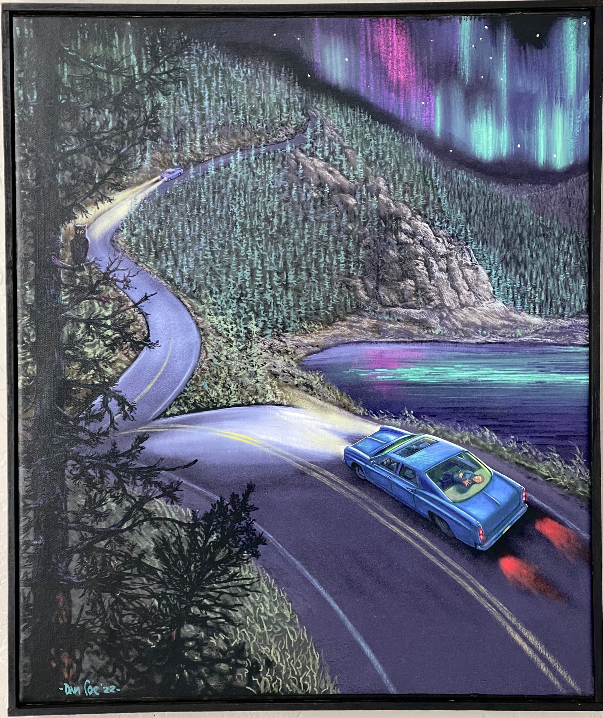 The 1960s evoke distant memories of safety and seatbelt laws, while a young boy is transfixed by the wonders of the universe. A 20.5”x24.5” canvas print, mounted on 3/4” stretchers and enclosed in a black pine strip frame, is elevated by acrylic paint embellishments and the artist's signature.